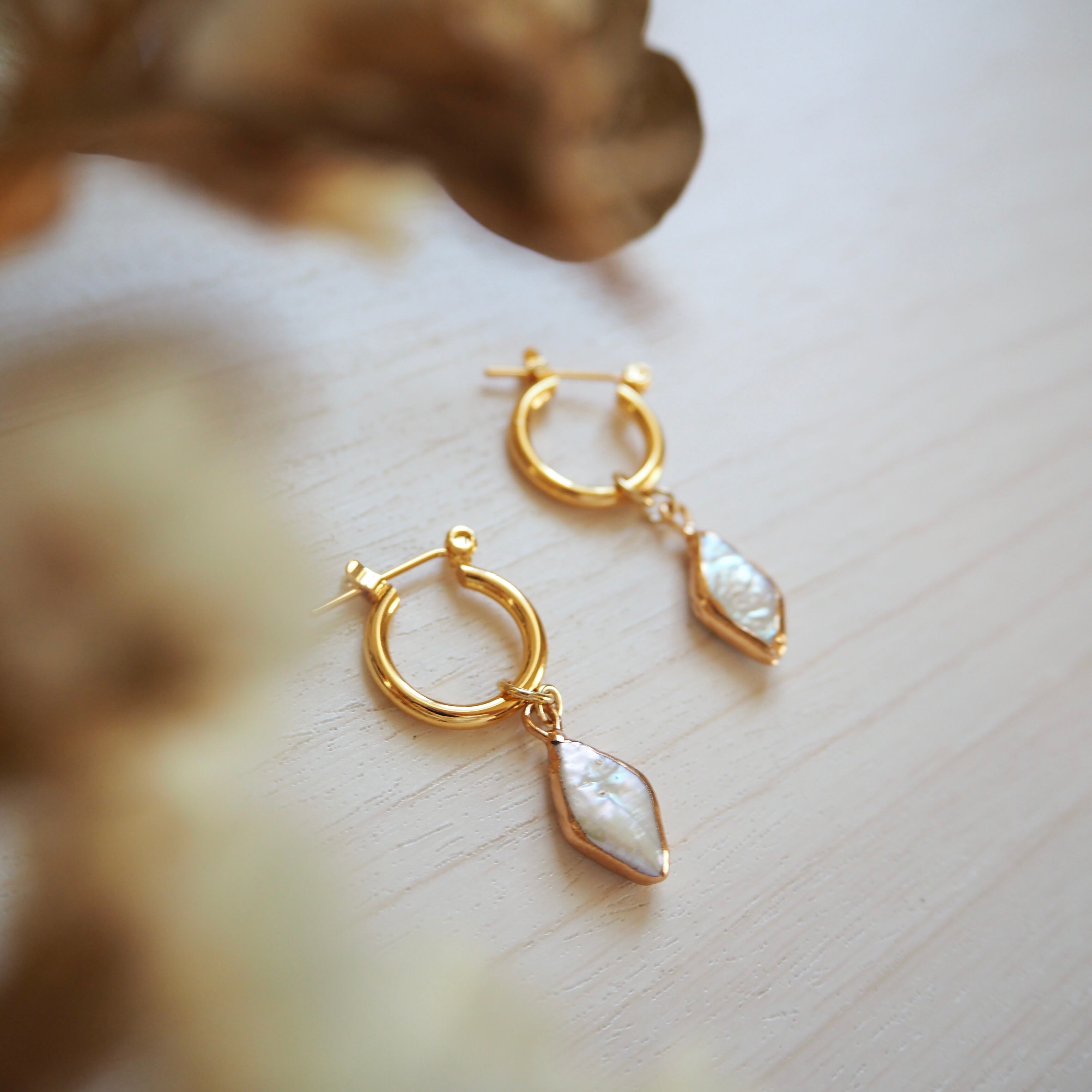 天然淡水パールゴールドコーティングチャームフープピアス/サージカルステンレスピアス