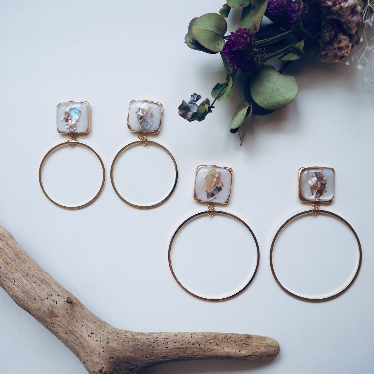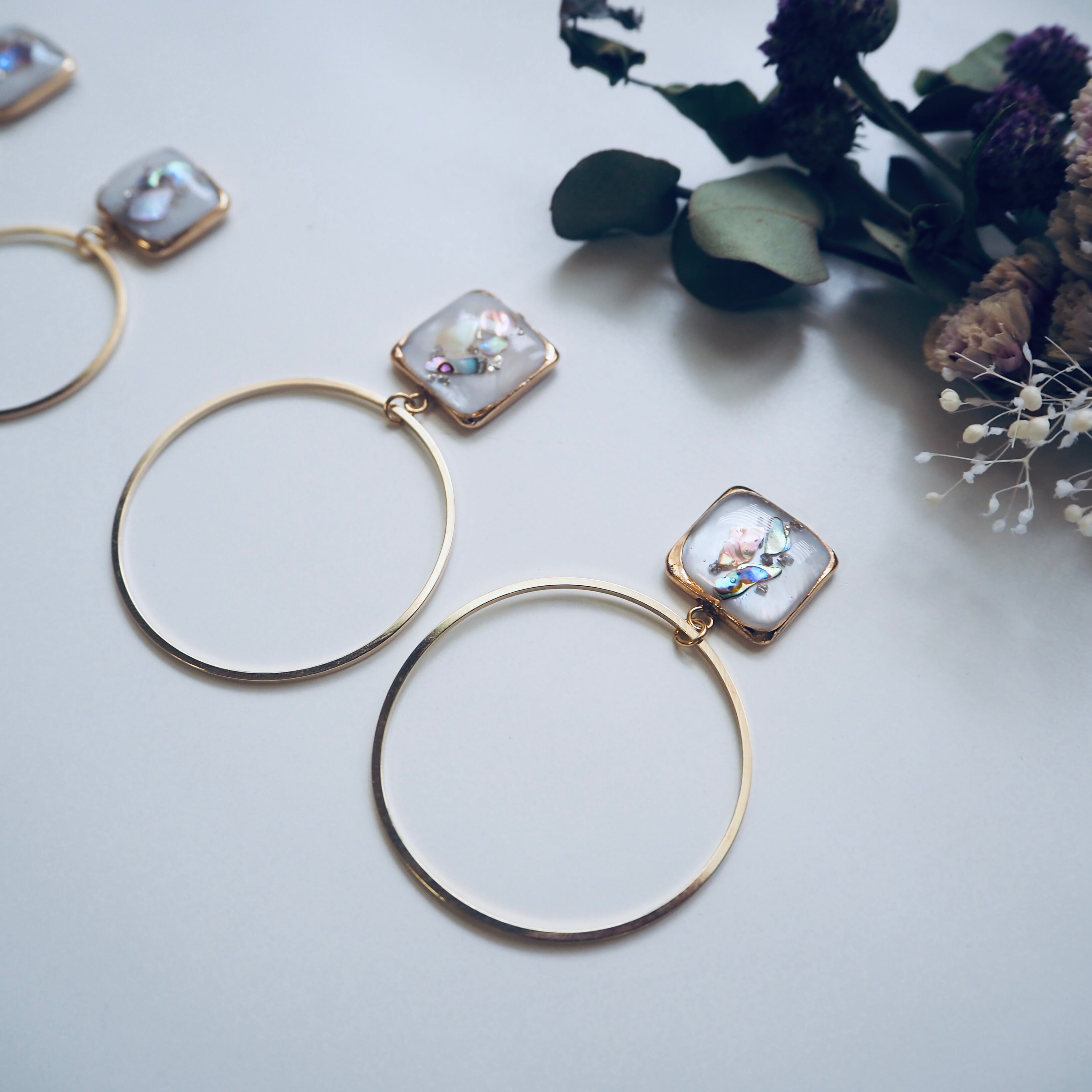 スクエアシェルにフープが揺れる大人可愛いピアスです。